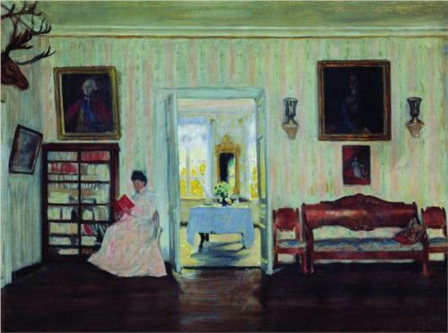 Everyday I am thankful for the sanctuary of home and the simple pleasures it affords. This painting caught my eye because I have a small library cabinet about the same size as the bookcase pictured. Mine has some open shelves at the top with glass doors on the bottom.