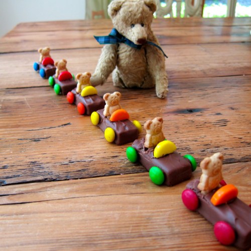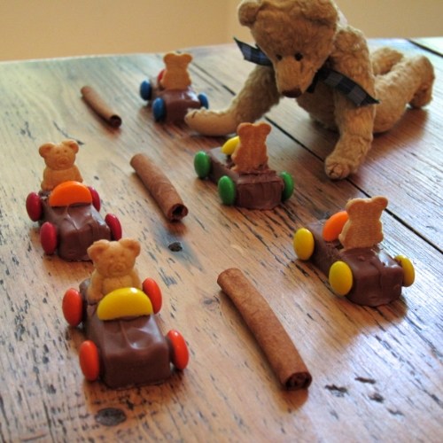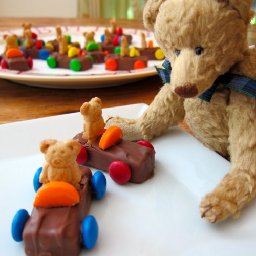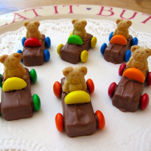 Fun project for the munchkins — trickiest part is pushing the teddy graham into the candy bar without splitting it apart too much. I just melted some chocolate chips to “glue” on the M&M’s and steering wheels.