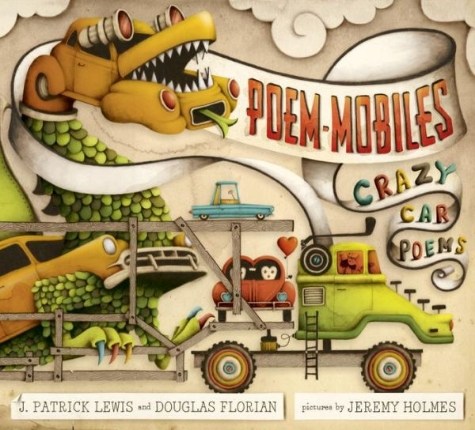 Now, a new book by either one of these beloved poets is a real treat, but having them write a book together is like having your cake and eating it two, three, maybe five thousand times. In Poem-Mobiles: Crazy Car Poems (Schwartz & Wade, 2014), Mr. Lewis and Mr. Florian have set their engines at full throttle, pulling out all the stops when it comes to inventing 21 crazy dazy cars of the future.