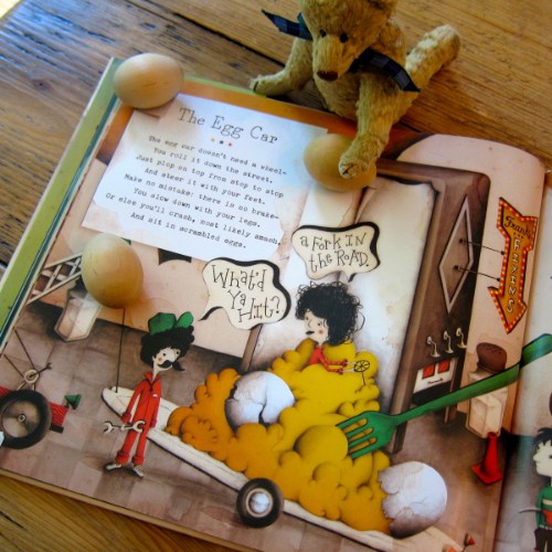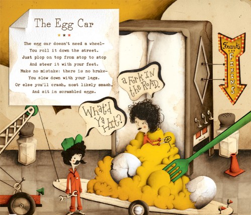 Now, while I’m pumped up about all the poems in this book, I must admit to being a teensy bit partial to the food poem-mobiles (big surprise). So today, I’m sharing “The Egg Car,” “Hot Dog Car,” and “The Banana Split Car.”