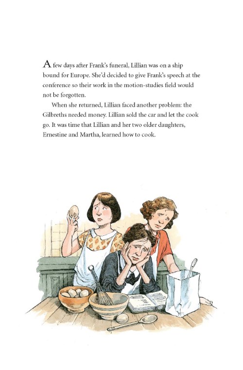 I wanted to add another female inventor to the mainly male cast. Margaret Knight’s story (In the Bag!) is popular with girls, so I’m hoping Lillian Gilbreth’s story will prove to be equally inspiring. There are plenty of women inventors, but finding one with the amount of material needed is a challenge. Mary Anderson, for example, invented the windshield wiper, but little else is known about her and, with only the one invention to her name, there isn’t enough grist for the mill. On the other hand, Lillian Gilbreth’s life offers enough material for several books!
