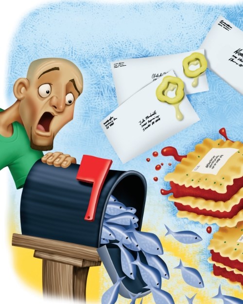 But though Ms. Cash, Mr. Stamply, and Mr. Pumper all love eating and playing at Rocco’s (“his spaghetti is still the greatest!”), they’re afraid the craziness might interfere with business as usual (“rows of pizzas baking in the bank vault,” “pepperoncini on envelopes instead of stamps,” “gas pumps would pump tomato sauce instead of gas”).