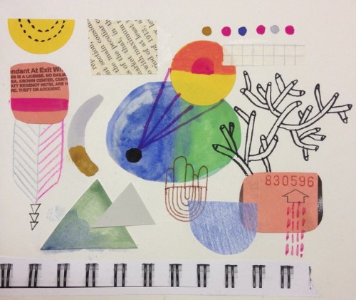 Pictured above is a collage she created this past summer called “Aqua Daydreams.” I loved it the moment I saw it — mermaids, jellyfish, the different shapes, lines, colors, and overall composition of the piece with its touches of whimsy and playfulness. It feels childlike and sophisticated at the same time, definitely invites a closer look, and much like the rest of her work, elicits unabashed joy and happiness.