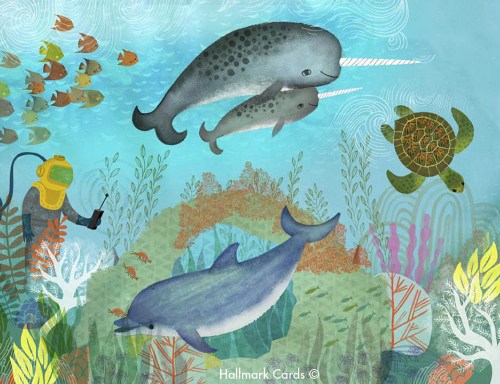 Two illustrations for the first two wedding cards Hallmark had ever done geared toward lesbians and gays (collaborated with designer Lindsay Tippet), a pop up card and e-card about under the sea, and a brand I co-created with a talented writer buddy named Linda Morris, called Ultra GoGo about four girls with different interests and they had a talking cupcake pal named Jimmy.