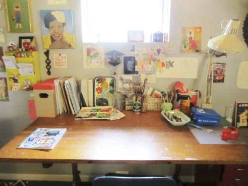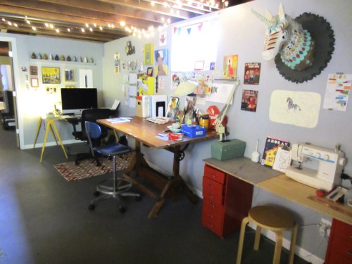 My studio is in our home basement. We re-finished it last summer before our son was born. Very stressful but worth it! I like a lot of color and fun things around me — fave books, artwork, toys, my happy stuff, etc. — a big paper mache unicorn head is on the wall, drawings my daughter did when she was little.