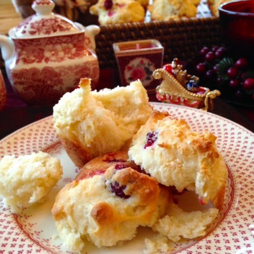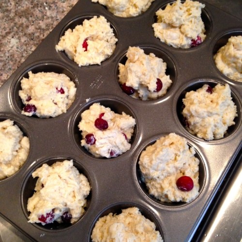 I opted for cranberries and made 12 large muffins instead of the suggested 16 (too lazy to wash two muffin tins). The batter came together quickly and the muffins were done in about 20 minutes. These are best warm with a smathering of real butter. Mmmmm!