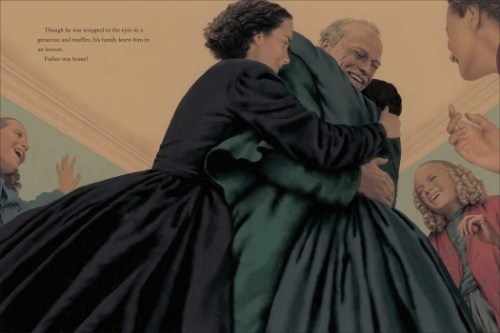I love how the interplay of light and dark in Bagram Ibatoulline’s rich gouache paintings underscores the themes of resilience and steadfast hope. The light of familial closeness, happiness and abiding faith burn brightly in the comforting glow of candlelight and the oranges, reds and golds of crackling fires. This ever present warmth of the human heart, the inextinguishable flame within, is set against a rich, dark palette representing the cold and bleakness of winter, the trials of war and ill-health, and realistic 19th century interior illumination. The strong subdued colors also have an old-fashioned feel, reminding us of the timeless legacy of Little Women with its enduring relevance and appeal (the double page spread of the Alcotts’ Christmas dinner is especially gorgeous, and there are beautiful depictions of the Orchard House exterior).