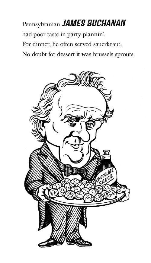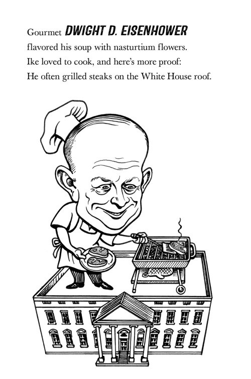 In keeping with the clerihew’s rules, the first lines of these poems end with the person’s name, and I like Raczka’s spot-on descriptions: “Toothache-prone George Washington,” “Fashion-conscious Chester Arthur,” “Electric-shock victim Benjamin Harrison,” “Fresca fanatic LBJ,” “Cover-upper Richard Nixon.” Best zinger of all? “Relaxer-in-chief George W. Bush.” Did you know he took more than 900 days of vacation while in office? 😀