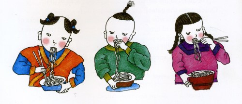 While most of the tales were adapted and retold from original sources, Yee also contributed three original stories based on traditional fairytale/folktale themes and motifs. It just so happens that my favorite story in the book is a Yee original, “Stretch and Fold, Stretch and Fold,” which is about the origin of noodles. 🙂