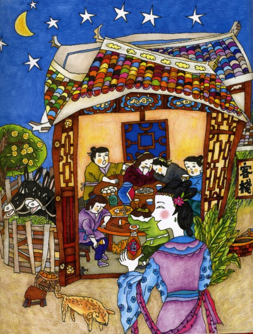 I also especially liked “Third Lady of Plank Bridge” (remind me not to eat any buckwheat cakes lest I turn into a donkey) :), and “The Hall of Contented Cravings,” where a chef is charged with cooking seemingly impossible dishes to please the King (“cook a dish that contains the sky”). The chef’s poetic response (“Sky Blue White Clouds”) reminds us that cooking is a transcendent art form (“cloud ears, mushrooms as blue as the sky, and the wings of high-flying birds”).