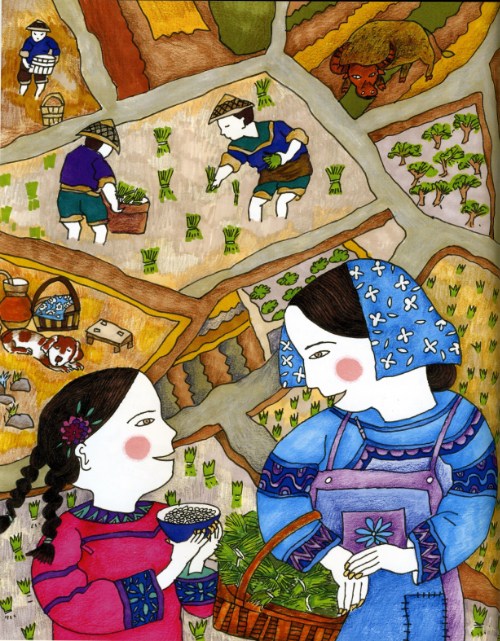 I also love how Yee has included notes and Chinese proverbs with each story for fascinating historical and cultural context. Some are culinary notes (Chinese bread, rice, watercress), while others cite the tale’s “Old Story Pattern” or prevailing literary motif (the quest, cautionary tale), or its connection to Buddhism or Taoism. There are also tasty tidbits about story origins (a famous novel, an opera) as well as other general insights into Chinese culture (significance of mountains and fish).