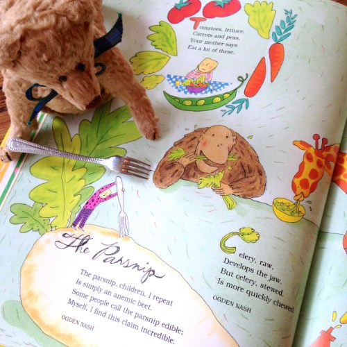 I’d never heard of it either! Thank goodness I stopped by here. I placed an order for it at my local library, and I may very well end up following that path to a purchase, like you. We want to do some food poems in our after school poetry class this spring, so it couldn’t have come at a better time. Your presentation here, as always, is so charming. I was laughing all the way through–especially at the parsnips and spinach poems.
