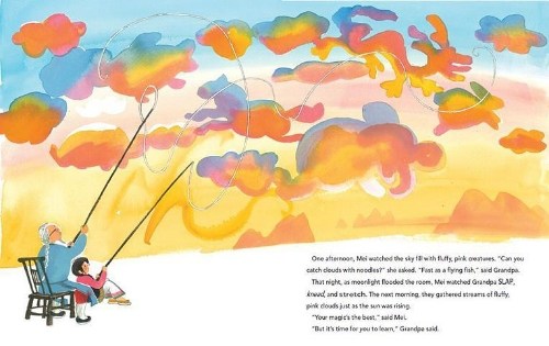 I do love Thong’s captivating, lyrical narrative, and how she’s portrayed the warm and loving relationship between Mei and Grandpa Tu, with his delightful poetic speech. He is the grandfather every child might wish for, one who can lasso animal-shaped clouds with his noodles, and who provides gentle guidance, encouragement, and inspiration in just the right amounts.