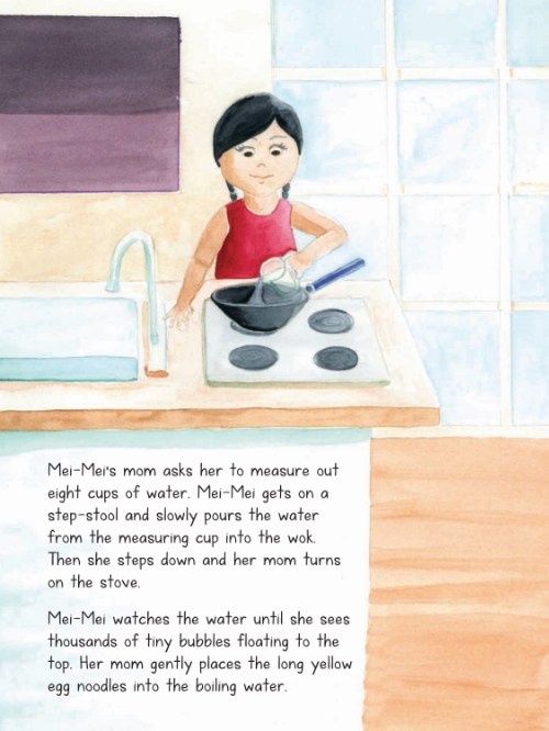 Mei-Mei is understandably excited from the moment she wakes up. On this special day, she gets to wear a beautiful new red dress, and once in the kitchen, she watches and helps her mom cook (taking out the wok, measuring water and pouring it, cleaning the mushrooms, draining the bamboo shoots, adding vegetables to the wok and stirring them). Once her mother combines the noodles with the veggies, Mei-Mei is anxious for a taste, but they must wait for the party guests to arrive. For Mei-Mei, it’s the perfect celebration. After all, there’s nothing better than eating and sharing a dish she helped to make. Mmmm!