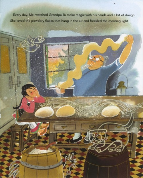 3. Well, I am fascinated with the noodle pulling, That second book especially looks so sweet. How can one not love a “grandfather every child might wish for, one who can lasso animal-shaped clouds with his noodles”. Thanks, Jama.