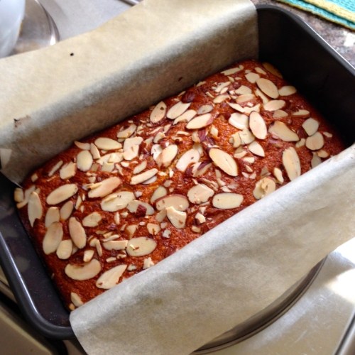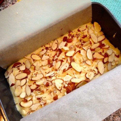 Using a rubber spatula, pour and scrape the batter into the loaf pan, evenly coat the top with the sliced almonds, place the loaf pan on an ovenproof tray, and bake 30 minutes.