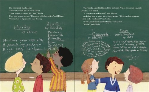 Supremely confident, somewhat braggy Elinor plans to wear jeans with six pockets when Ms. Crane comes, with an original poem stashed in each one. She dives right into studying everything and anything about poetry a full month ahead of the class. When April rolls around, Mr. Tiffin teaches them about figures of speech (similes, metaphors), and different poetic forms (haiku, acrostic, concrete). Everyone has fun reading sample poems and writing their own, while strangely silent Elinor has nothing to share, reassuring the others that she will come up with something amazing for Ms. Crane’s visit.