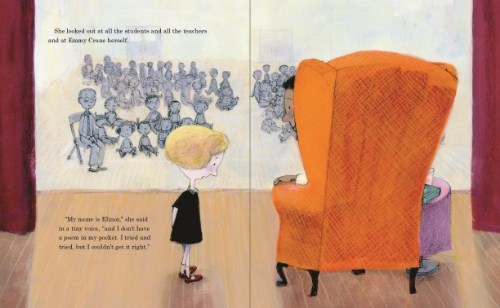 At the assembly, Ms. Crane reads some of her poems and answers student questions. Soon it’s time for Elinor’s classmates to go up on the stage to read their poems. Mr. Tiffin tells Elinor she doesn’t have to go up if she doesn’t want to, but Elinor doesn’t want to disappoint Ms. Crane. She tells the famous poet how hard she tried to write the perfect poem. Kind Ms. Crane tells Elinor that “No poem is perfect,” then asks her to close her eyes and tell her about the poems she wanted to write.