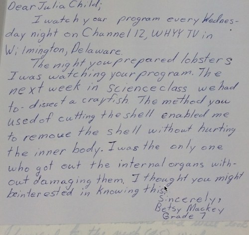 Oh, those letters from kids! I think I might have squealed when I opened those. They were all handwritten in that wonderful kid handwriting. One girl talked about earning her cooking badge for Girl Scouts, and one boy asked about studying at Le Cordon Bleu. My favorite was from a 7th grade girl who told Julia that she’d been the only one in her Biology class to successfully dissect a crawfish because she cut it the way Julia had cut her lobster on TV the night before.