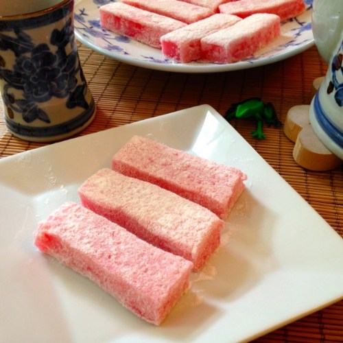 Although today chi chi dango is widely available in local Hawai’i supermarkets, it is easy to make at home, even a home as far away as Virginia. You can find Mochiko, usually sold in one pound white boxes, in Asian grocery stores or sometimes in the international foods section of supermarket chains. It’s just a matter of combining wet and dry ingredients, baking the mixture for a full hour at 350 degrees, and then letting it cool completely (preferably overnight) before slicing and dusting with potato starch. Goes perfectly with green tea and tends to disappear in a flash.