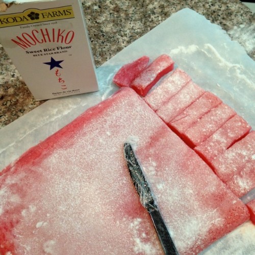 4. Turn the pan of mochi out onto a sheet of parchment paper lightly dusted with potato starch. Cut into bite size pieces using a plastic knife (wrap the blade in plastic wrap for easier slicing). Roll pieces in potato starch and shake off excess before serving. Stays fresh for 1-2 days in an airtight container.