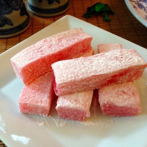 These soft and chewy confections/Japanese “dumplings,” are made with sweet rice flour and coconut milk and are very popular in Hawai’i. Though I love all forms of mochi now, chi chi dango was a special childhood favorite because it didn’t have the sweet azuki bean filling of regular round mochi rice cakes. It was deliciously plain and like biting into a slightly sweet, mildly nutty cloud. Such a yummy treat — something my mom never made, only purchased every now and then.
