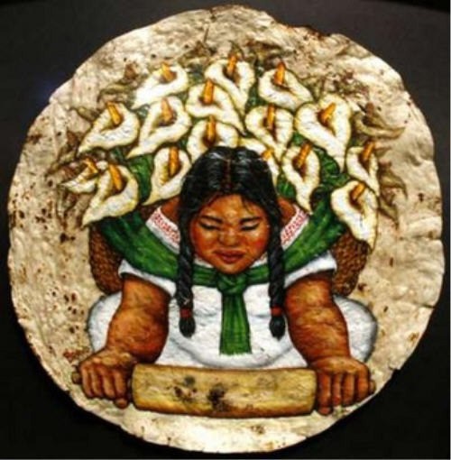 I use the Tortilla as a Canvas because it is an integral part of the Hispanic Culture and my heritage. For the subject matter of my tortilla paintings, I use imagery that is representative of Latinos, conveying their hopes, art, beliefs and history. As the tortilla has given us life, I give it new life by using it as an art medium.
