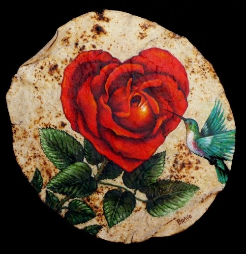 OK, I love tortillas. I mean, I live in Texas – tortillas are everywhere. I love them in enchiladas and tostadas and tacos and quesadillas and, and, and, just with butter. But…I’ve never heard of anyone painting on tortillas. How unique and beautiful. Muy bueno, indeed!