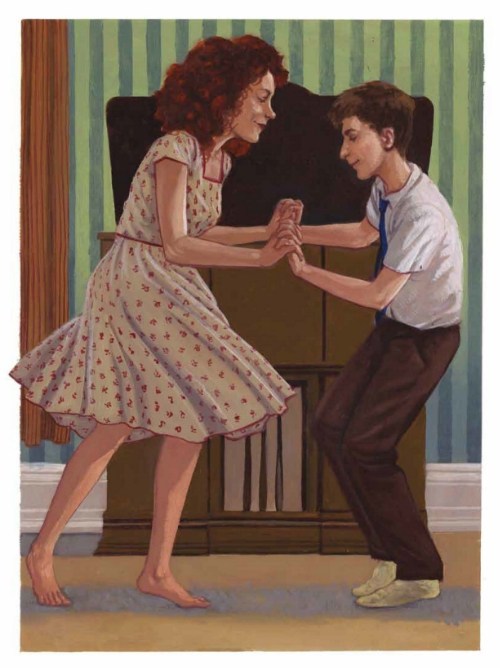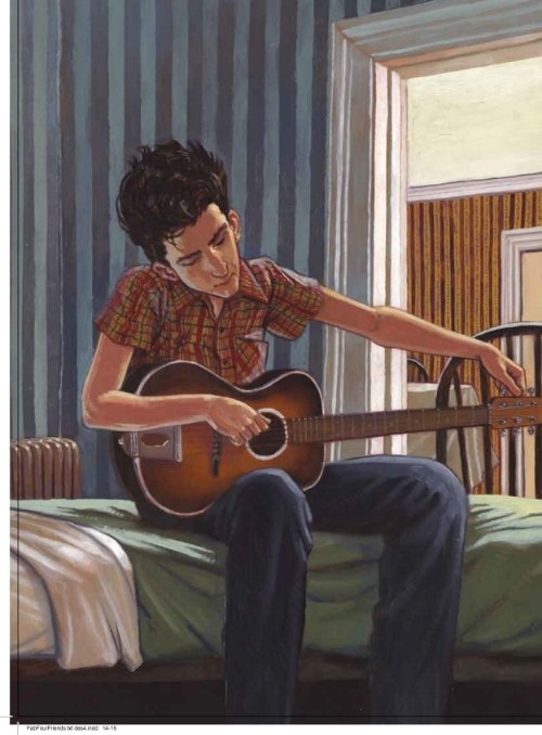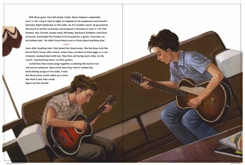 I love Adam’s illustrations! They’re so beautiful and full of life, and the painterly details are extraordinary. Look at the subtle coloration on the tub in John’s mum’s bathroom, or the play of light and shadow on the sheets and blanket of George’s bed. The boys’ likenesses are superb, their body postures so expressive. I especially appreciate the attention Adam paid to historical details in clothing, hairstyles, furniture. And the musical instruments! Getting those right was really important, not only because we wanted to be accurate, but because Beatles fans are real gearheads.