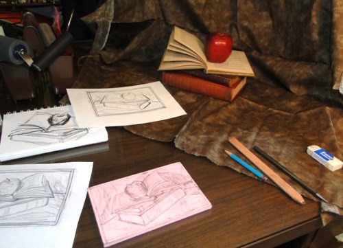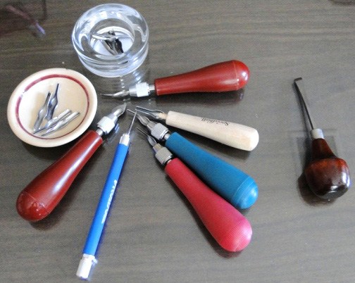 Printmaking definitely challenges the control-freak aspect of my personality, because the results can be serendipitous! I start with a pencil drawing on thin paper (love my Ebony pencils), then lightly coat the finished sketch with graphite to transfer it onto a block of wood or a carving block (softer to cut and easier on the arm and hand). I simply sketch over the lines from the reverse side, and the graphite transfers the sketch in onto the block.