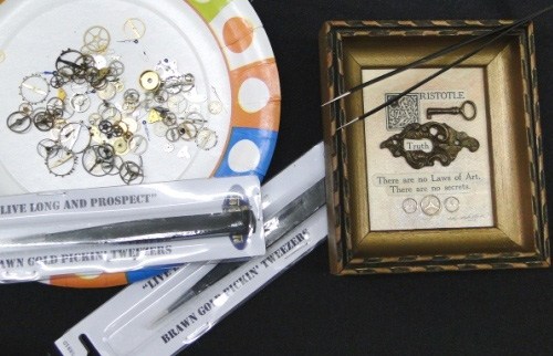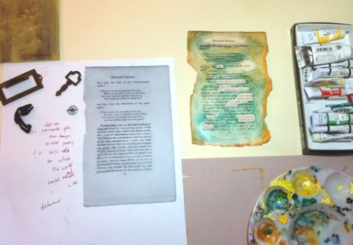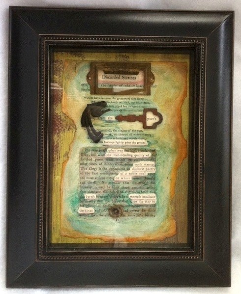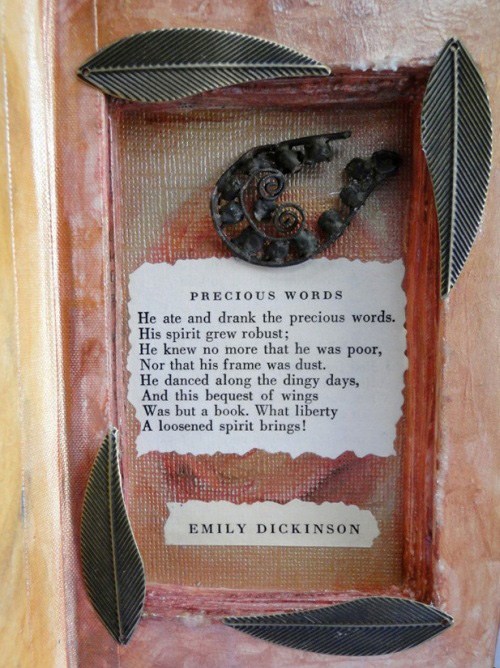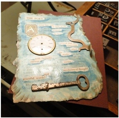 I have deep wells of curiosity and wonder, so I enjoy the challenge of exploring various forms. Assembling a piece of art (or jewelry) for me is like composing a poem – it’s all about selection and connection. Juxtaposing a broken brass remnant and a clipping of 100-year-old text to create a certain effect is much like trying out certain words and sounds together in my writing. I want to include everything, but I can’t, so choosing just the right individual elements (or words) uses up a lot of my gray matter.