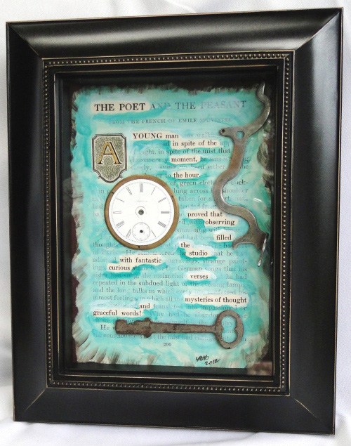 I love how you make collages with altered book pages and found items. Could you tell us a little backstory about one of your favorite pieces?