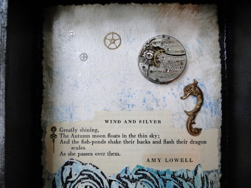 Since my favorite thing is always what I’m working on at the moment… I was recently asked by a poet friend to make a mixed media piece as a birthday gift. My friend and I had enjoyed the harvest moon together, and since the recipient has a fall birthday, I knew when I found a short Amy Lowell poem called “Wind and Silver” in a 1928 anthology that I wanted to use it. It can take me a long time to find the right words and elements for a piece.