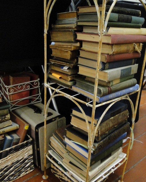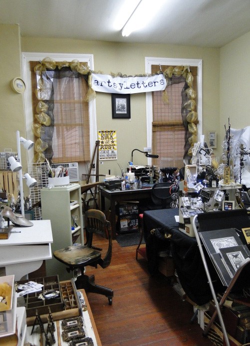 I do have a lot of stuff everywhere! But I have to pick up on occasion when I open as a shop to visitors. The palette knives I had as a small child are handy, along with my first easel. I share the space with lots (and lots) of books – many become fodder for my projects and even jewelry, and then I have art books for inspiration and techniques. I do love the vintage metal cabinets and flat files which house my bits of treasures, most of which are organized in old printing trays. I love those trays, too!