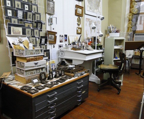 Items you make: Literary art with a vintage vibe… drawings and hand-pulled prints, note cards and bookmarks, mixed media art celebrating words, letters, & found poems, and typewriter key jewelry. Among other things!