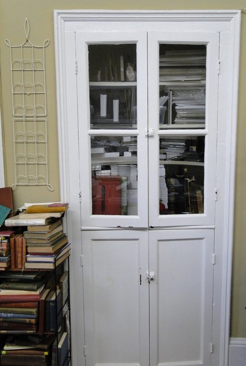 My studio has high ceilings, old wood floors with decades of character, and great natural light through two large windows. Which is good, because the fluorescent lights might take an hour or two to all come on, depending on their mood and the weather. A built-in cabinet with glass doors stole my heart when I first saw the space.