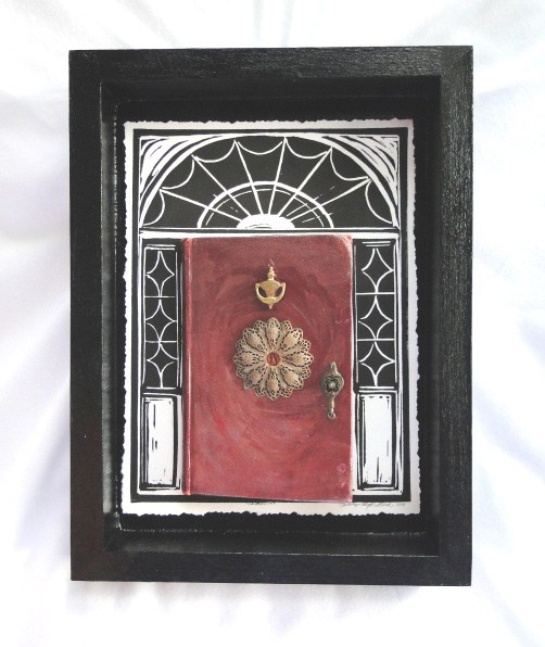 Some favorites: printmaking tools/knives, snappy black ink, Stonehenge paper, crow quill pens, vintage books and texts, typewriter keys, flourish-y bits of antique metal hardware, letterpress blocks (wood or metal), lamp black paint, and dreamy acrylic colors I can swirl. On a daily basis I use: my fingernails (really – they are super-strong!), tiny prospector tweezers for positioning text, etc., or retrieving jump rings for jewelry, and wine corks, which make terrific miniature brayers for tight spaces in collages.