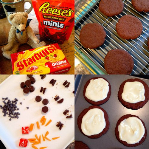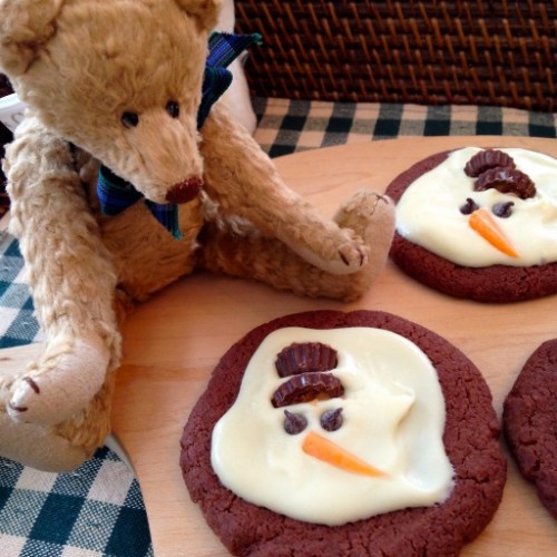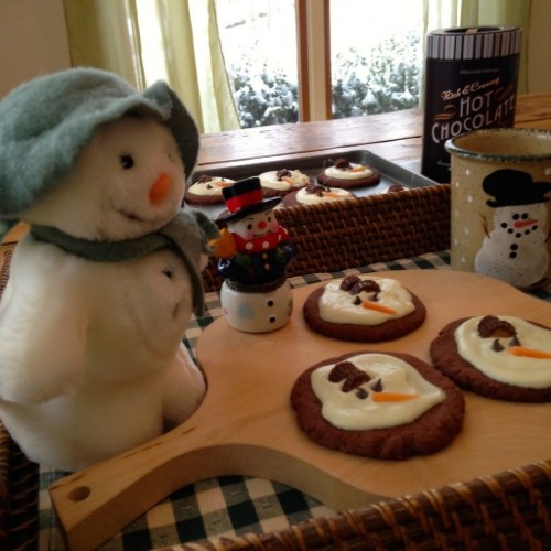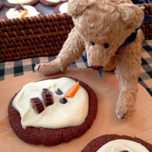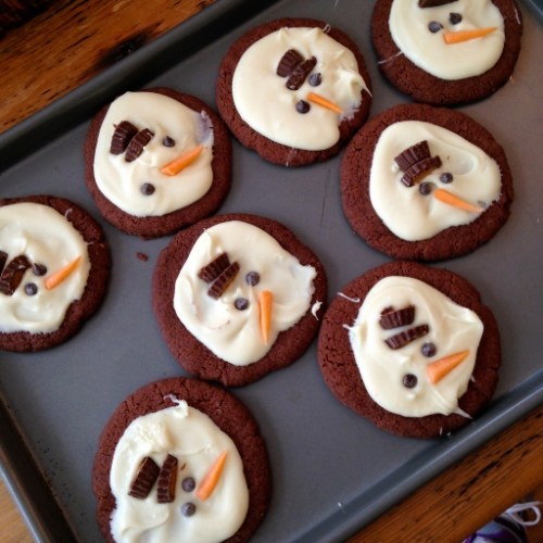 We decided on Nigella’s Chocolate Shortbread Cookies — a very rich, decadent buttery delight that is sinfully delicious all on its own (probably the best chocolate cookie I’ve ever eaten). We then drizzled some melted white chocolate onto each cookie before adding mini peanut butter cups for the snowman’s hat, mini chocolate chips for his eyes, and a diagonally sliced piece of orange Starburst candy for his carrot nose.*