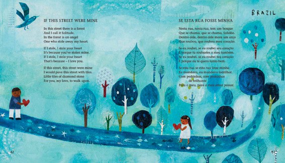 It would have been nice if a pronunciation guide was included, and if each of the poems’ languages was identified. It’s reasonable to assume a poem from Japan is in Japanese, but what about a poem from Switzerland, where there are several official languages? Is Maori something you recognize at first glance? There is some information in the Credits and Acknowledgements, but not all the languages are mentioned.