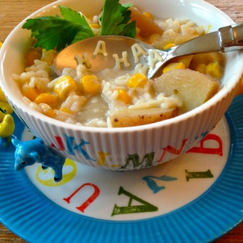 Corn and potato chowder, yum! Easy and delicious.