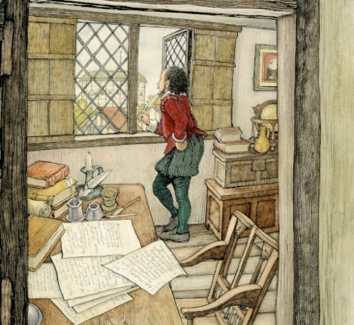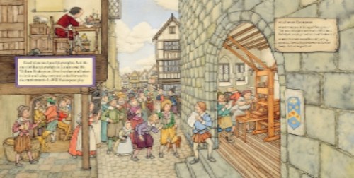 Keen-eyed munchkins will enjoy a 17th century version of Where’s Waldo, as they eagerly search for the ‘hidden Will’ in each spread. The architecture, costumes, props and street scenes are a mini history lesson in themselves and pull readers right into the story — listen for the street peddlers hawking their wares, their wooden carts rumbling over cobblestones, while groups of hurrying women catch the latest gossip and children run riot in their play.