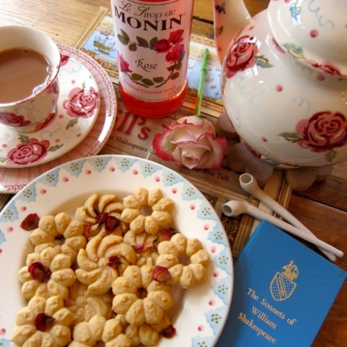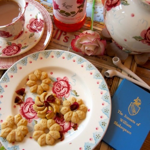 I found an appealing recipe for “1610 Rose Cakes” in Shakespeare’s Kitchen: Renaissance Recipes for the Contemporary Cook by Francine Segan, which contains updated recipes from classic 16th and 17th century cookbooks. In Shakespeare’s day the sweets course following a nobleman’s meal was called the “banquet.” Sugar was considered an aphrodisiac; “the banquet was specifically designed to ‘moveth pleasure and lust of the body.'” The banqueting dishes the sweets were served on had images or poems on them (often containing double entendres or sexual innuendos). Bawdy bards!