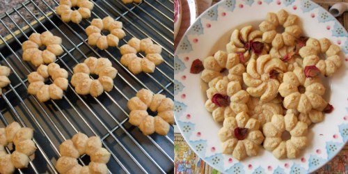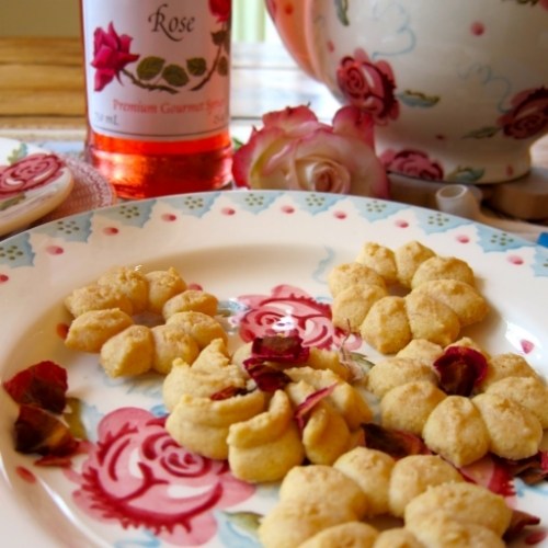 2. Preheat the oven to 350 degrees F. Using a cookie press in the shape of a flower, press out the cookies onto a well-buttered, nonstick baking sheet (or drop by tablespoonfuls) and bake for 10 minutes. Brush the remaining 2 tablespoons of rose syrup on the hot cookies and sprinkle with the crushed rose petals.