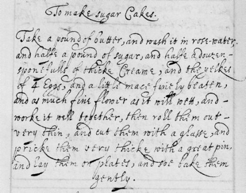 Always of the opinion that anything sweet is a poem unto itself, I enjoyed learning a bit more about the rose or “sugar” cakes, which came from Mistress Sarah Longe’s handwritten recipe book. This collection was for her personal use and not published in her lifetime, and as was common at the time, contained not only recipes but medicinal instructions, since food was valued for its medicinal properties.