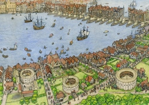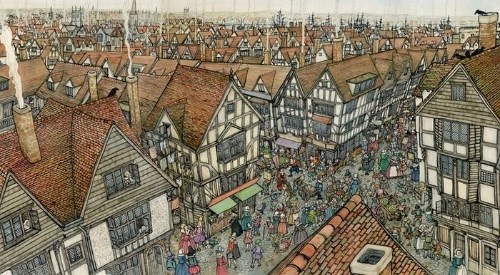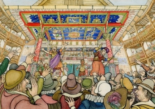 John Shelley’s masterful pen and ink and watercolor illustrations brim with meticulous detail and are a brilliant study in perspective. We are given panoramas of the city crammed with Tudor structures and teeming with a bustling populace, aerial views of the Globe, Garden and Rose theaters, as well as many interior scenes of the Globe from various vantage points.