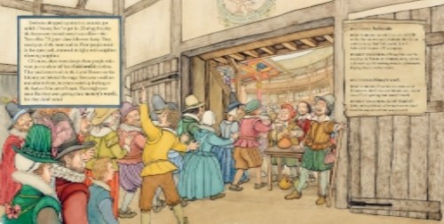 Ms. Sutcliffe includes just the kind of fetching theatrical detail young readers love: though one could buy refreshments like fruit, nuts, and beer, there were no restrooms; rich people could buy seats while poor people stood in an open yard crammed together; female roles were played by males; playgoers weren’t exactly the most well behaved (they made a lot of noise during the performances with their eating, talking, and belching).