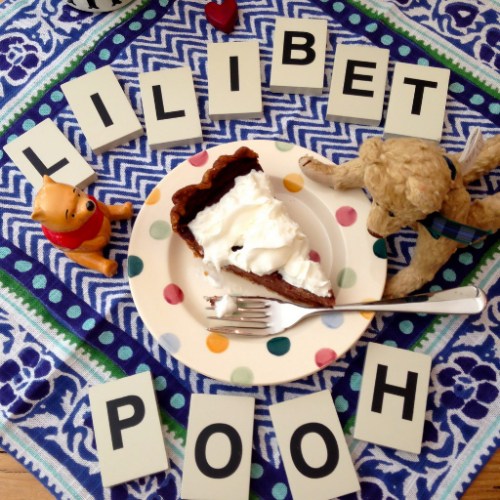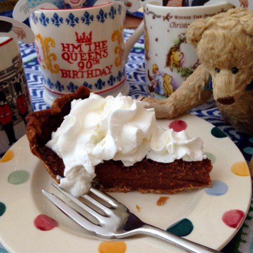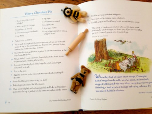 To celebrate the Queen’s and Pooh’s 90th’s, the Alphabet Soup kitchen helpers decided to make the Honey Chocolate Pie recipe from Virginia H. Ellison’s Winnie-the-Pooh Cookbook (Dutton, 2010). This made perfect sense since “hunny” is Pooh’s favorite and the Queen loves chocolate. 🙂 You may remember we made her favorite Chocolate Biscuit Cake when she stopped by to meet Mr Cornelius two years ago.