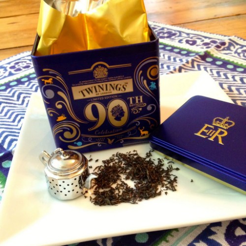 With the honey chocolate pie we’re serving the Queen’s 90th Birthday Tea by Twinings (her brand of choice). This special commemorative blend uses the finest quality black teas from three Commonwealth countries: full-bodied tea from Assam, India; refreshing Kenyan tea and a rich, smooth Sri Lankan variety. Very nice, indeed!