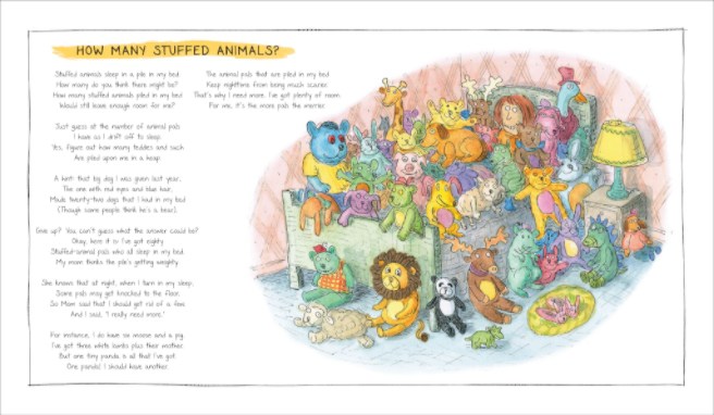 What a fun book. This describes my daughter’s philosophy: “How many stuffed animals piled in my bed/ Would still leave enough room for me?”