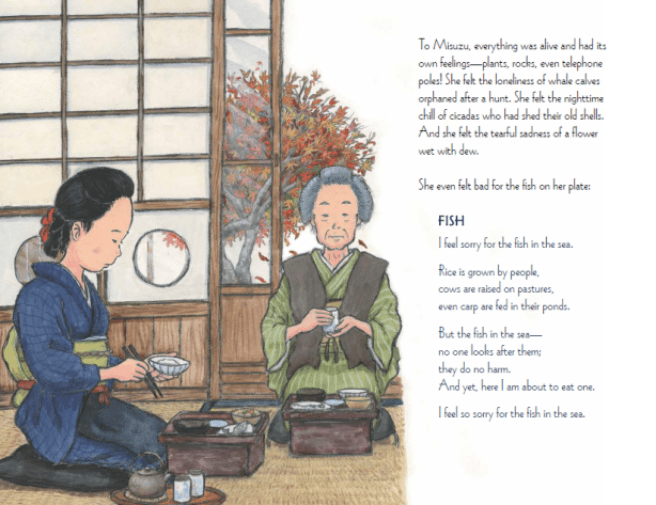 To Misuzu, everything was alive and had its own feelings — plants, rocks, even telephone poles! She felt the loneliness of whale calves orphaned after a hunt. She felt the nighttime chill of cicadas who had shed their old shells. And she felt the tearful sadness of a flower wet with dew.